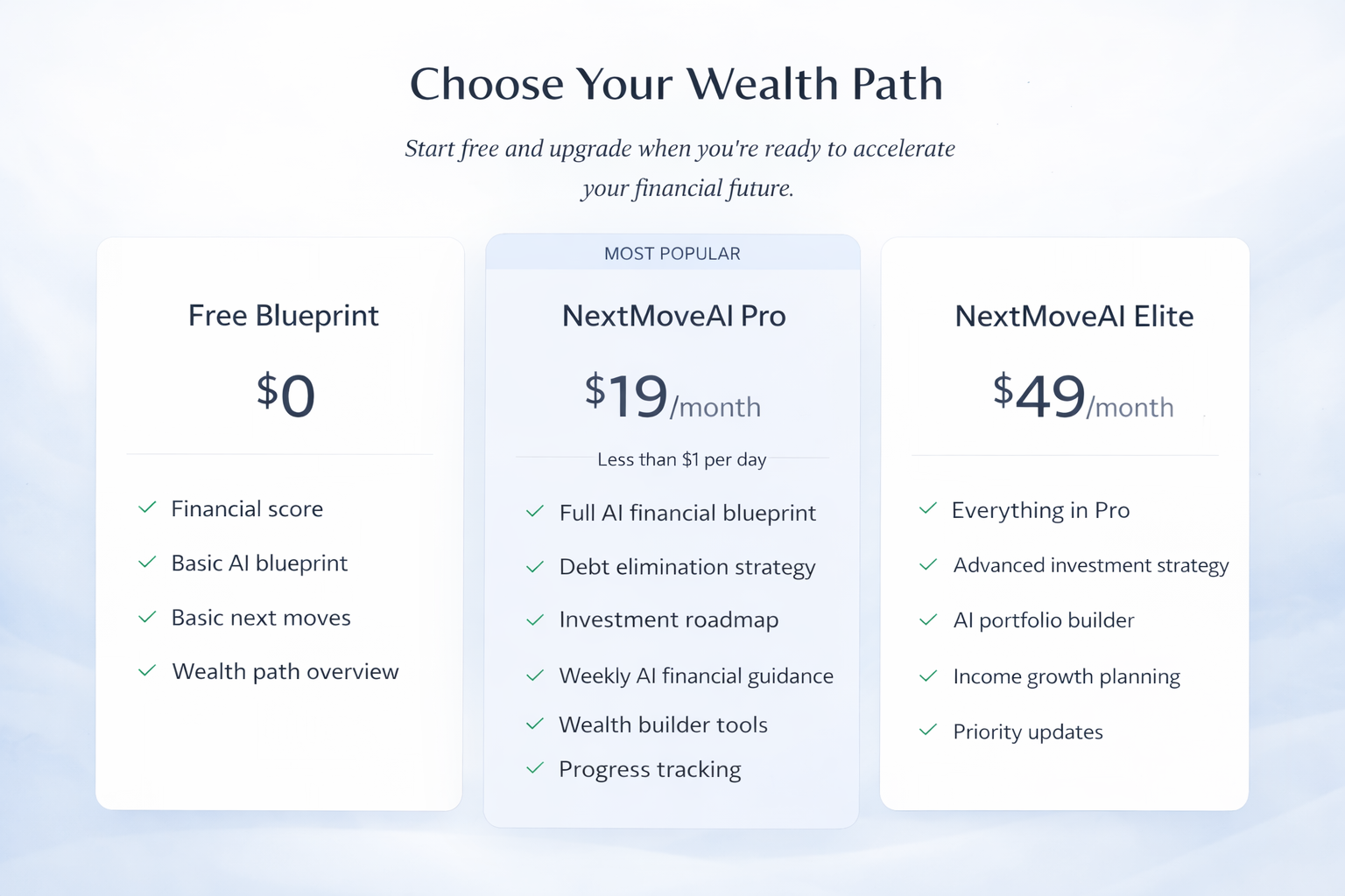 Start free. Upgrade when you’re ready to accelerate your wealth
